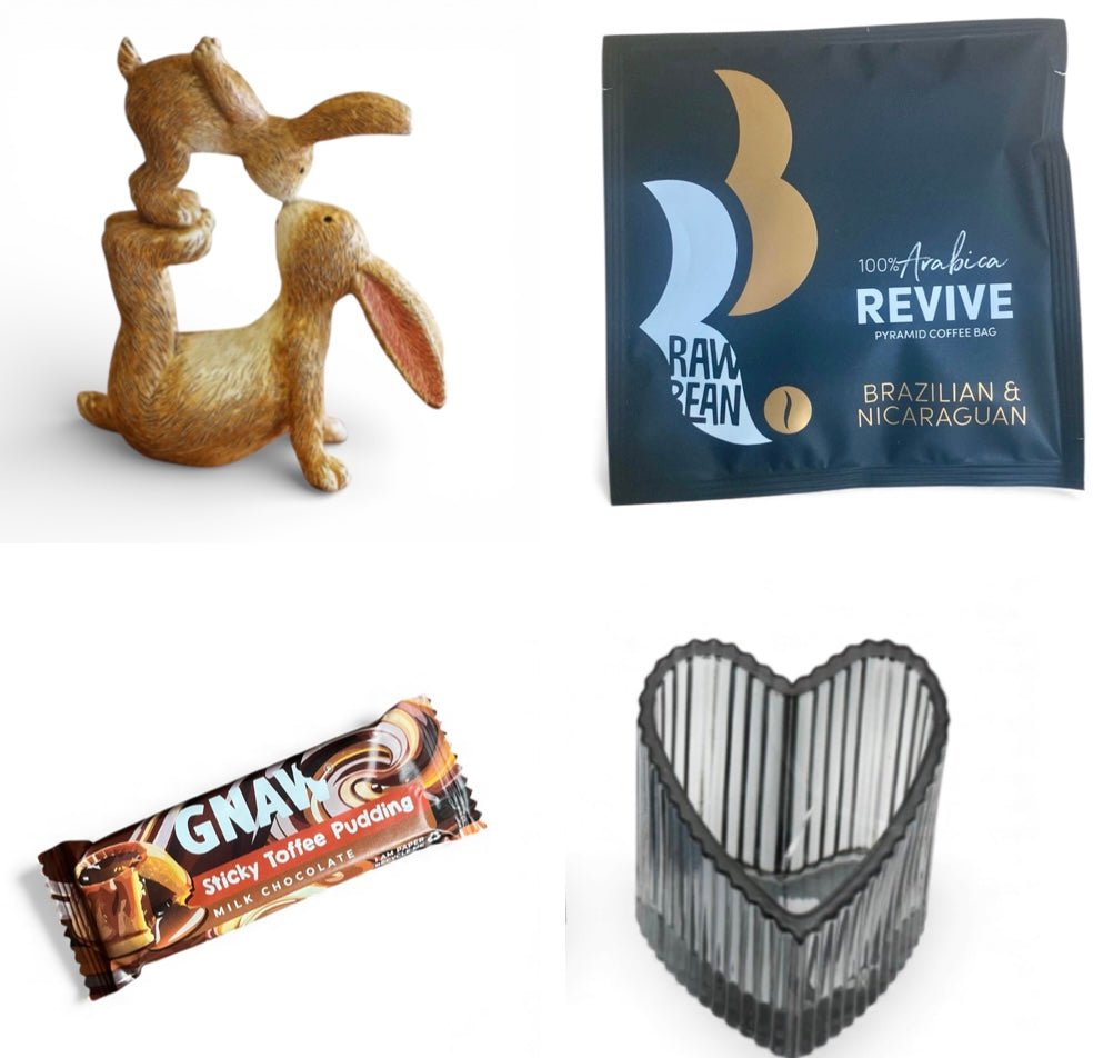 Add a touch of love with our Heart Shaped Tealight Holder in Black, Revive Coffee Sachet, a Sticky Toffee Pudding Snack bar, and Bella & Button, our cute Mother & Baby rabbit ornament. Enjoy a delicious treat with our unique gift box.