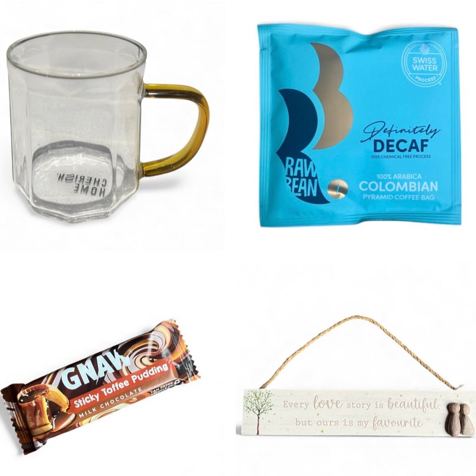 Add a touch of love with our Lotus Glass Mug, Revive Decaf Coffee Sachet, a Sticky Toffee Pudding Snack bar, and a Love Story Sign. Enjoy a delicious treat with our unique gift box.