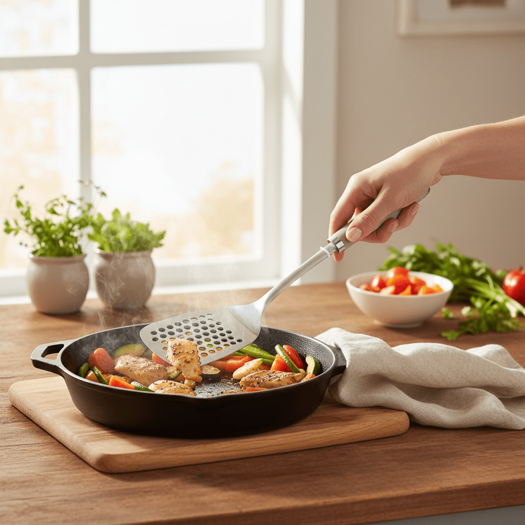 Precision Flipping: The wide, flat blade is tapered to slide easily under delicate foods, ensuring they stay intact and beautifully presented.