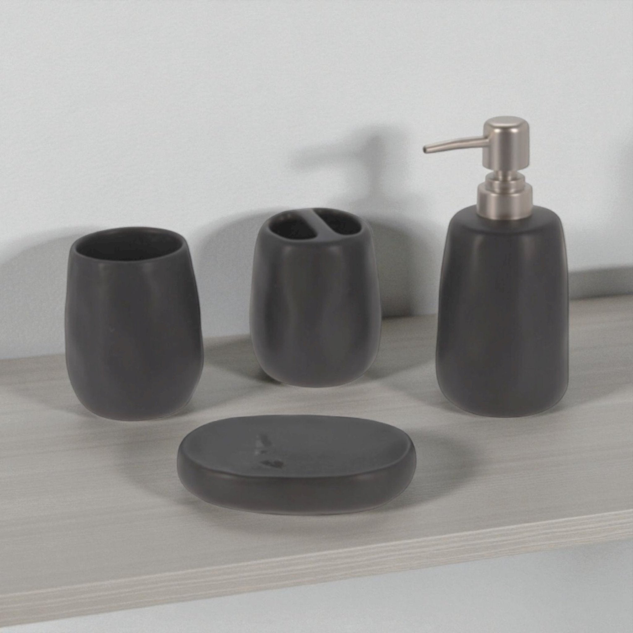 Instantly transform your bathroom into a stylish, spa-like retreat with this elegant 4-piece accessory set. Featuring a sleek, modern design and a luxurious matt stoneware finish, this set adds a touch of understated sophistication to any countertop. Say goodbye to mismatched plastic accessories and embrace a cohesive, contemporary look.