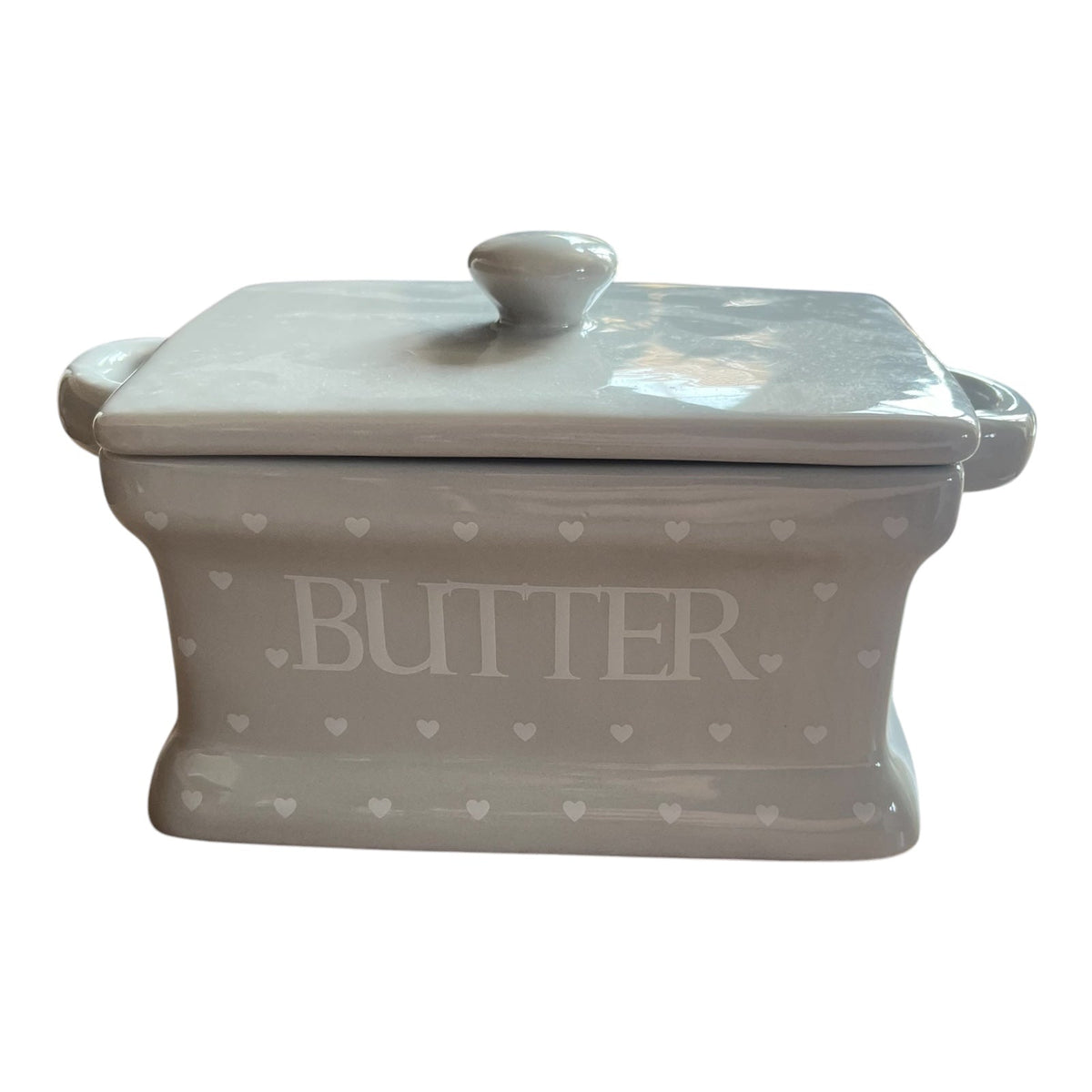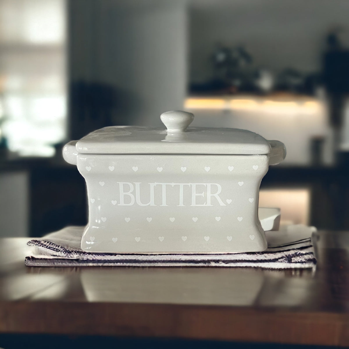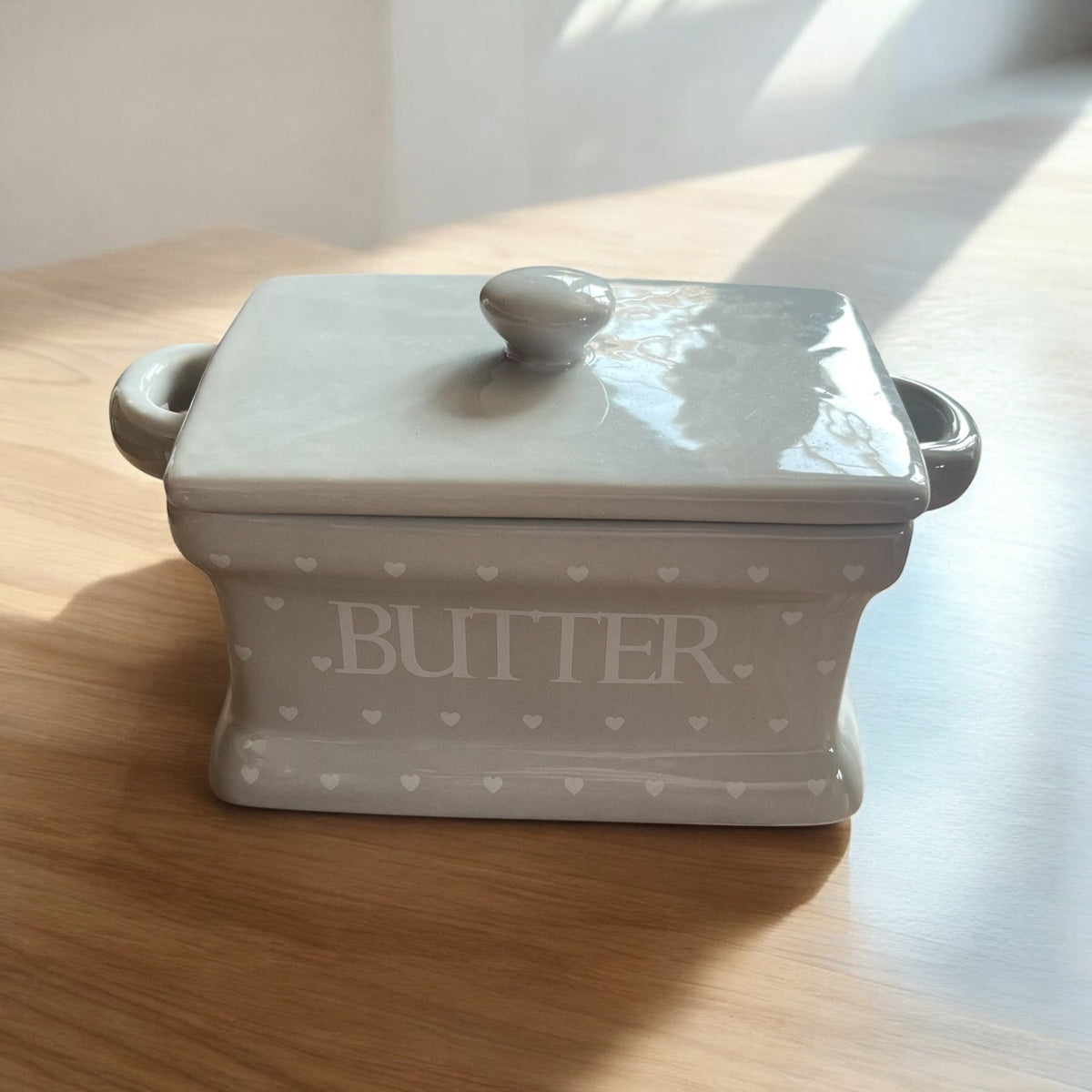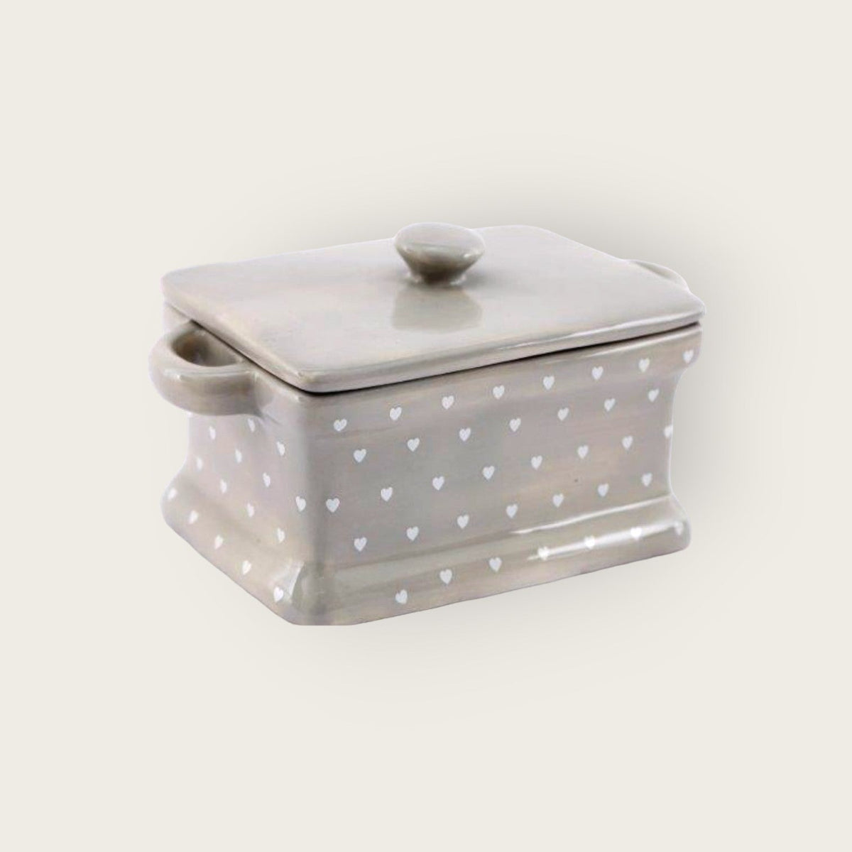 Spread the butter (and the love)! This adorable grey dish with sweet little white hearts will make even the plainest toast feel fancy. Crafted from durable dolomite, it's got a lid to keep your butter fresh and a smile that's impossible to resist.