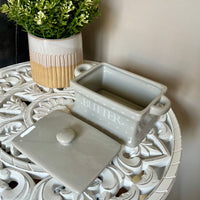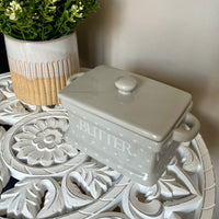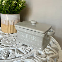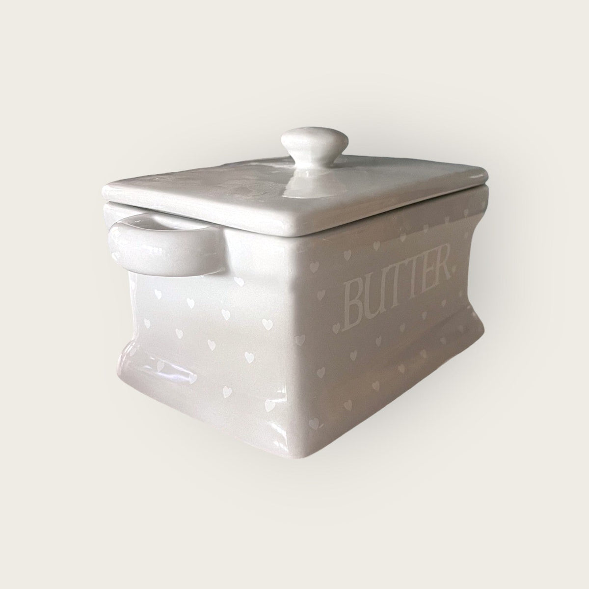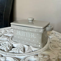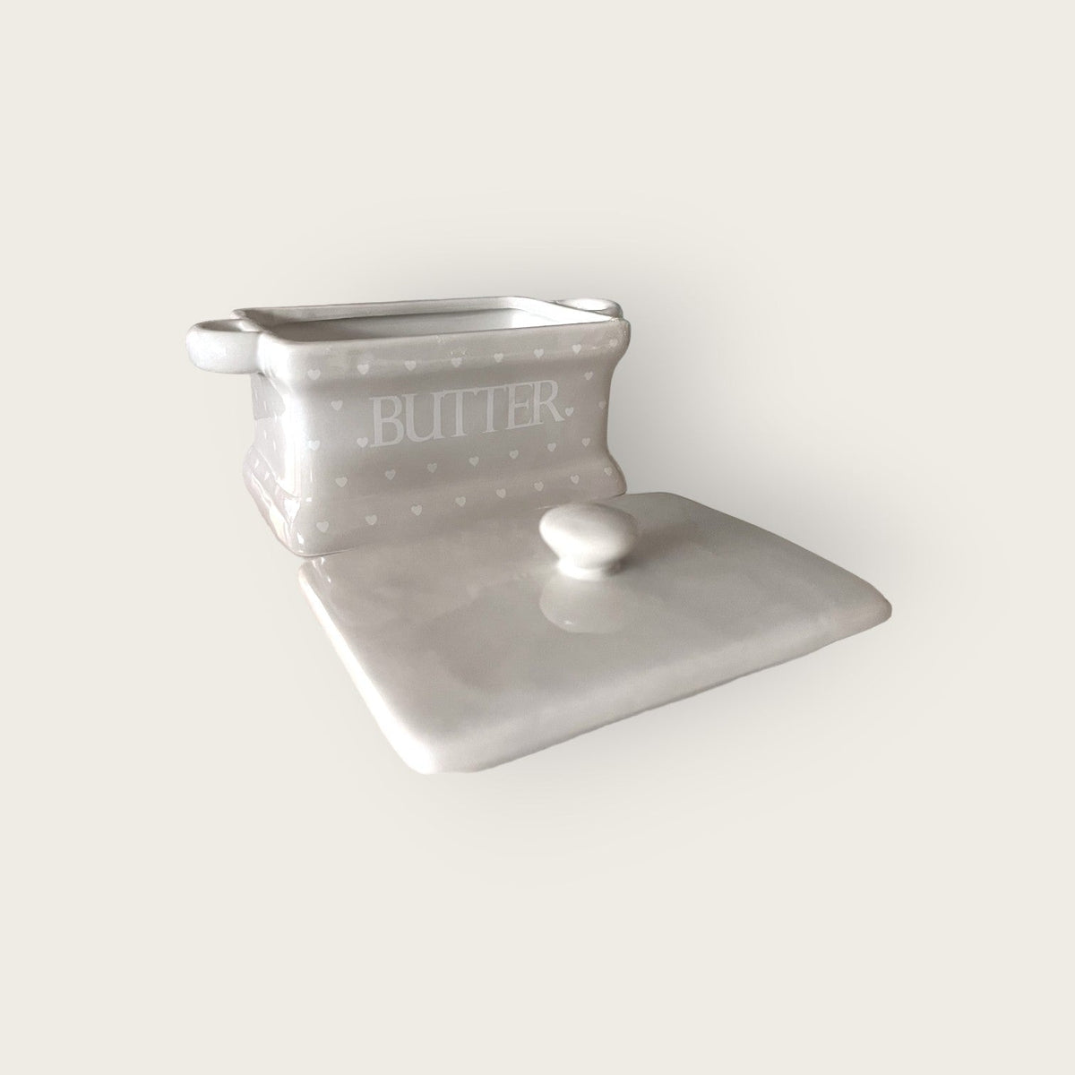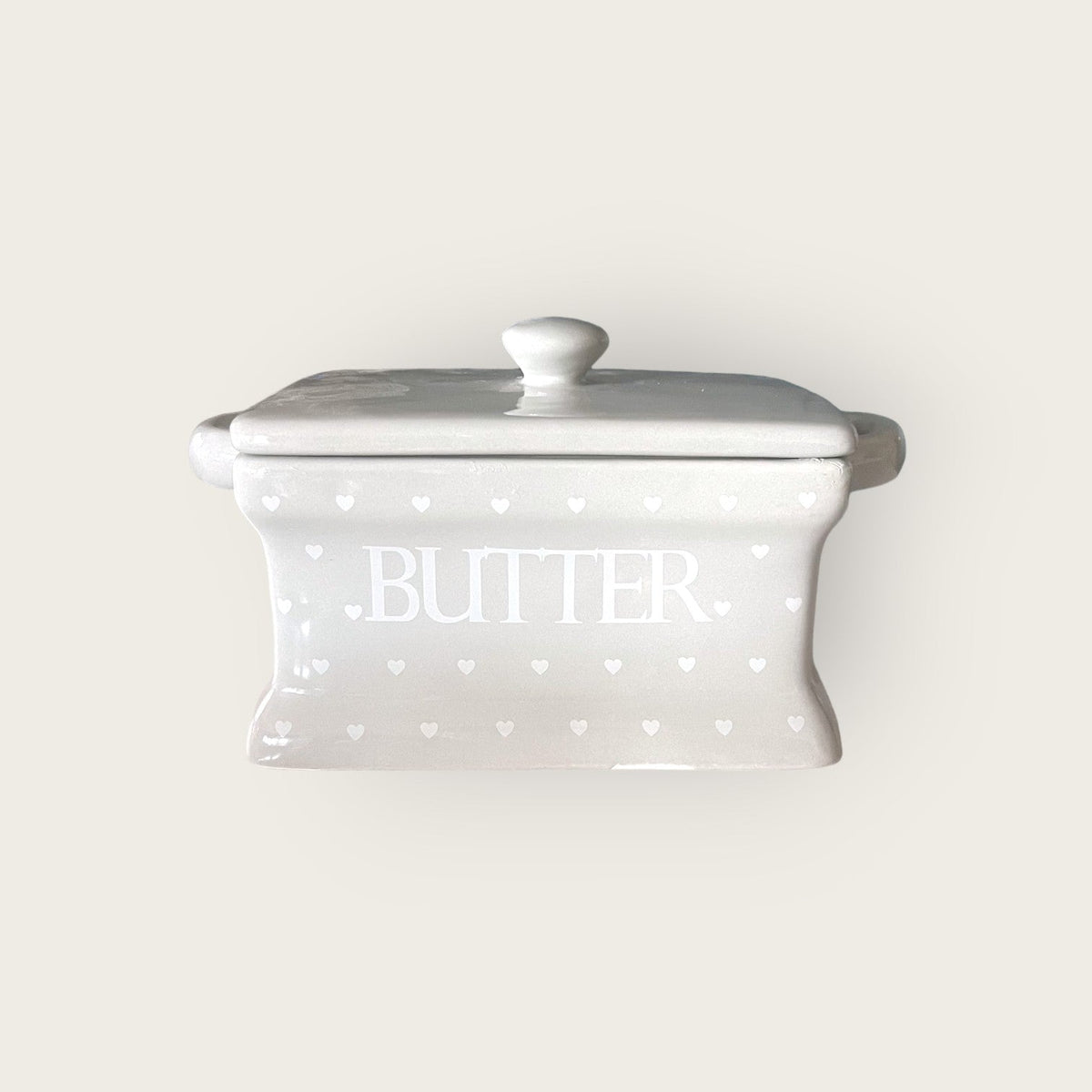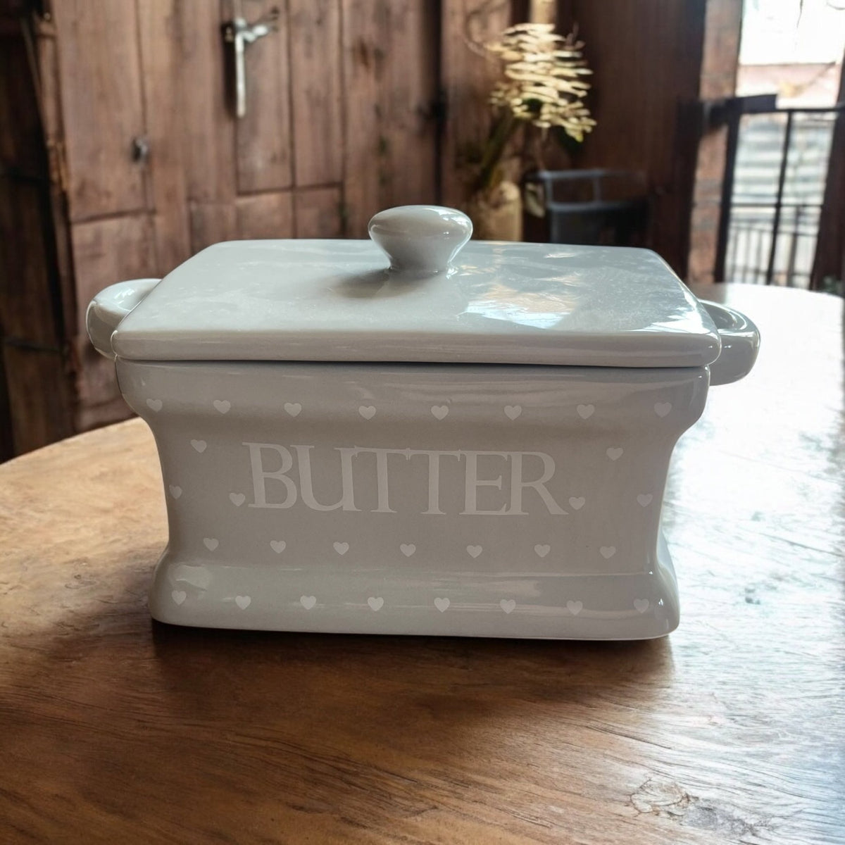 Spread the butter (and the love)! This adorable grey dish with sweet little white hearts will make even the plainest toast feel fancy. Crafted from durable dolomite, it's got a lid to keep your butter fresh and a smile that's impossible to resist.