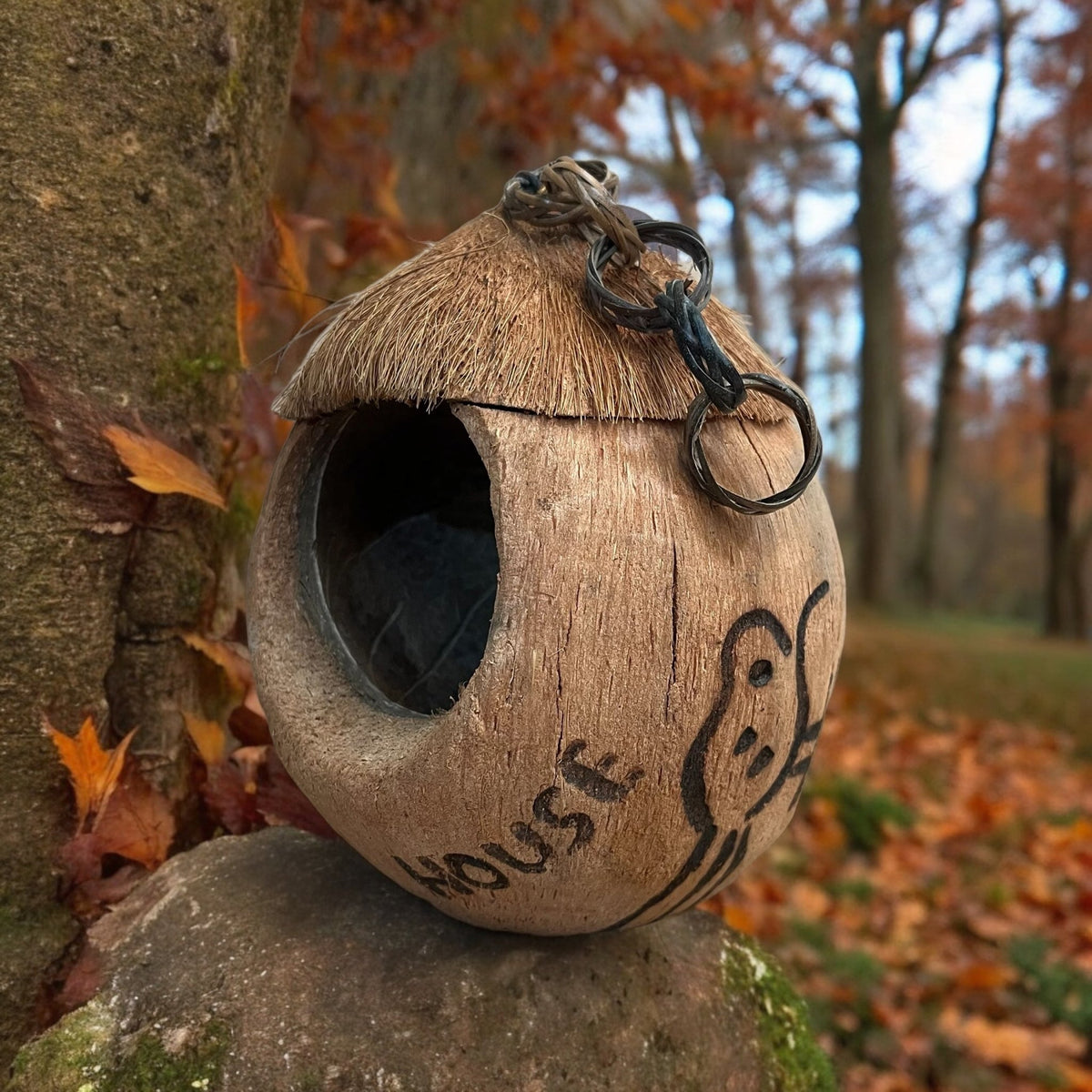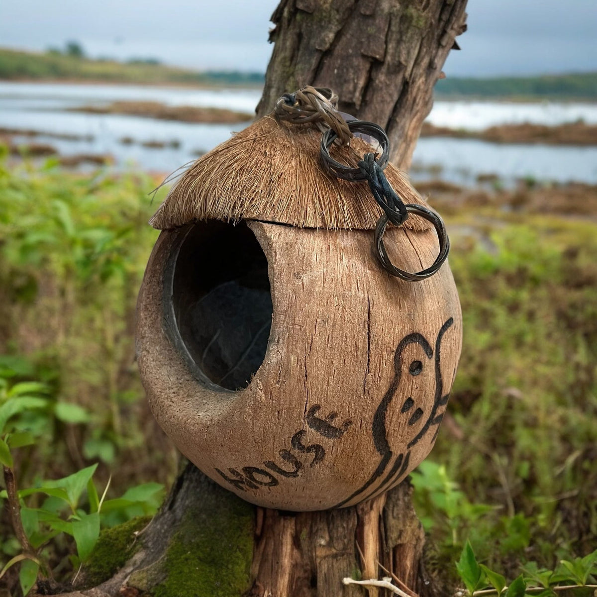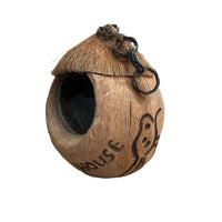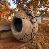 A great looking bird house in the shape of a coconut, for use in outdoor spaces and garden spaces this summer.