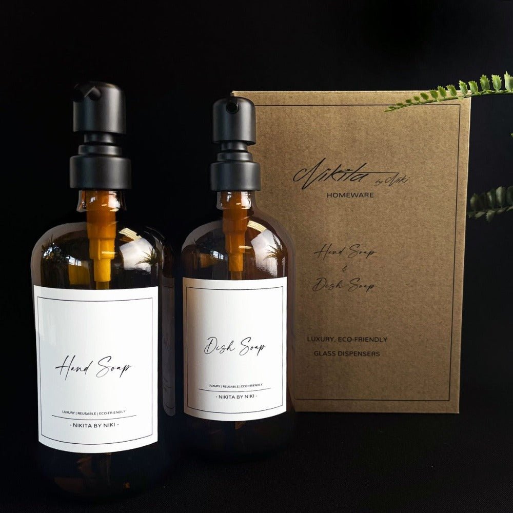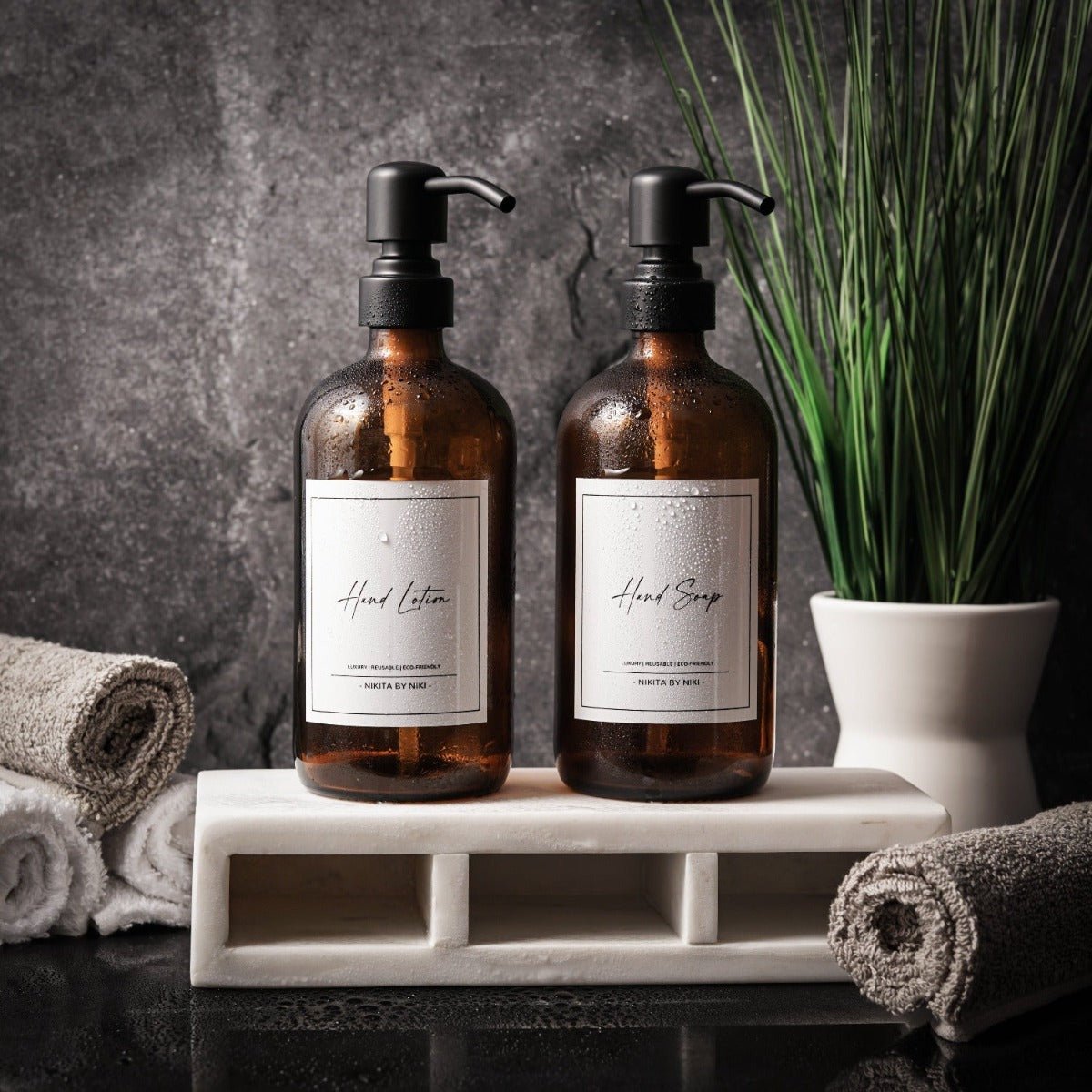 Introducing our luxury soap dispenser set of 2, designed to be displayed by your kitchen or bathroom sink. Choose from our hand soap and dish soap set, or our hand soap and hand lotion set and reuse to reduce plastic waste. Features includes: